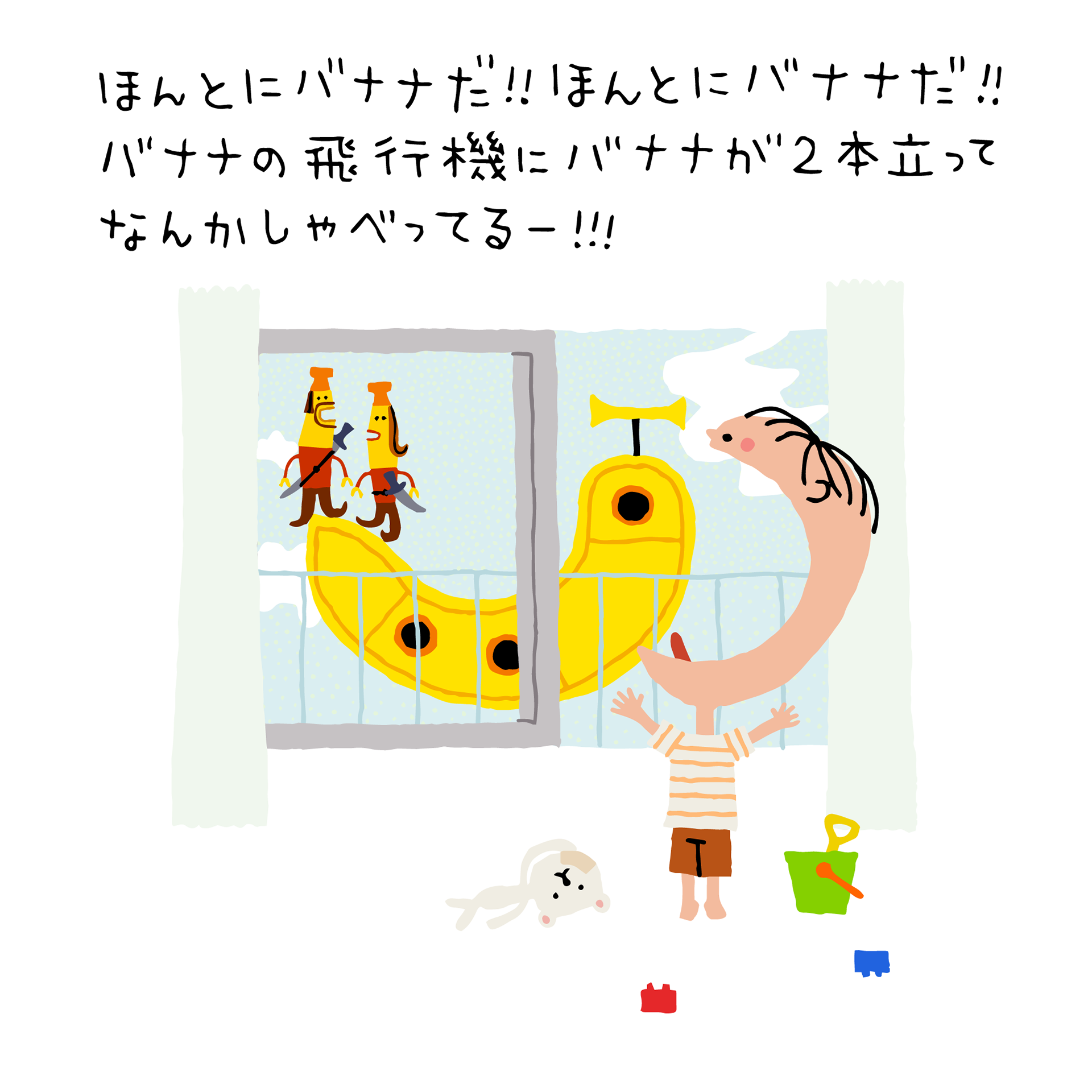 バナナの飛行機にバナナが2本立ってなんかしゃべってるー!!!